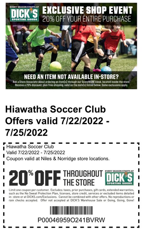 50% Off Dick's Sporting Goods Coupons, Codes 2022 - RetailMeNot Dick's Sporting Goods Coupons & Promo Codes Submit a Coupon In-Store Pickup Curbside Delivery Free Shipping UP TO 50% OFF Online & In-Store Black Friday! Up to 50% Off 1000s of Items Verified 1.5k uses today Get Online Deal Show In-Store Details See Details $20 OFF Sale $20 Off $100 When You Sign Up For Text Alerts Added by Rhinestonechoker DICK'S Sporting Goods Coupons & Promo Codes: In-Store & Online Sales DICK'S Coupons: While DICK'S doesn't offer conventional coupons for sales or discounts, there's a variety of amazing promotions and deals every day. DICK'S Clearance: Don't miss your chance to save with DICK'S most incredible deals by shopping all clearance sports apparel, footwear and gear. There's always something new at DICK'S Sporting Goods.